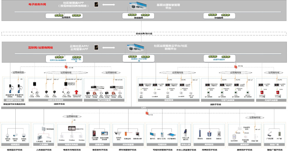 智慧社區(qū)綜合管理系統(tǒng)通過多級架構(gòu)的模式為不同的用戶提供多樣化應(yīng)用,整合門禁管理子系統(tǒng)、視頻監(jiān)控子系統(tǒng)、消防子系統(tǒng)、新能源汽車充電樁系統(tǒng)、非機(jī)動車充電樁系統(tǒng)、智能廣播系統(tǒng)等12個前端子系統(tǒng),通過智慧社區(qū)云平臺/社區(qū)聯(lián)網(wǎng)平臺進(jìn)行統(tǒng)一管理,在互聯(lián)網(wǎng)/運營商側(cè)形成消防監(jiān)管基礎(chǔ)能力,提供設(shè)備接入能力、基礎(chǔ)管理能力及數(shù)據(jù)接入?yún)R聚轉(zhuǎn)發(fā)能力,在電子政務(wù)外網(wǎng)側(cè)借助基層治理智慧管理平臺形成社區(qū)治理類、平安建設(shè)類、社區(qū)服務(wù)類三大應(yīng)用模塊。