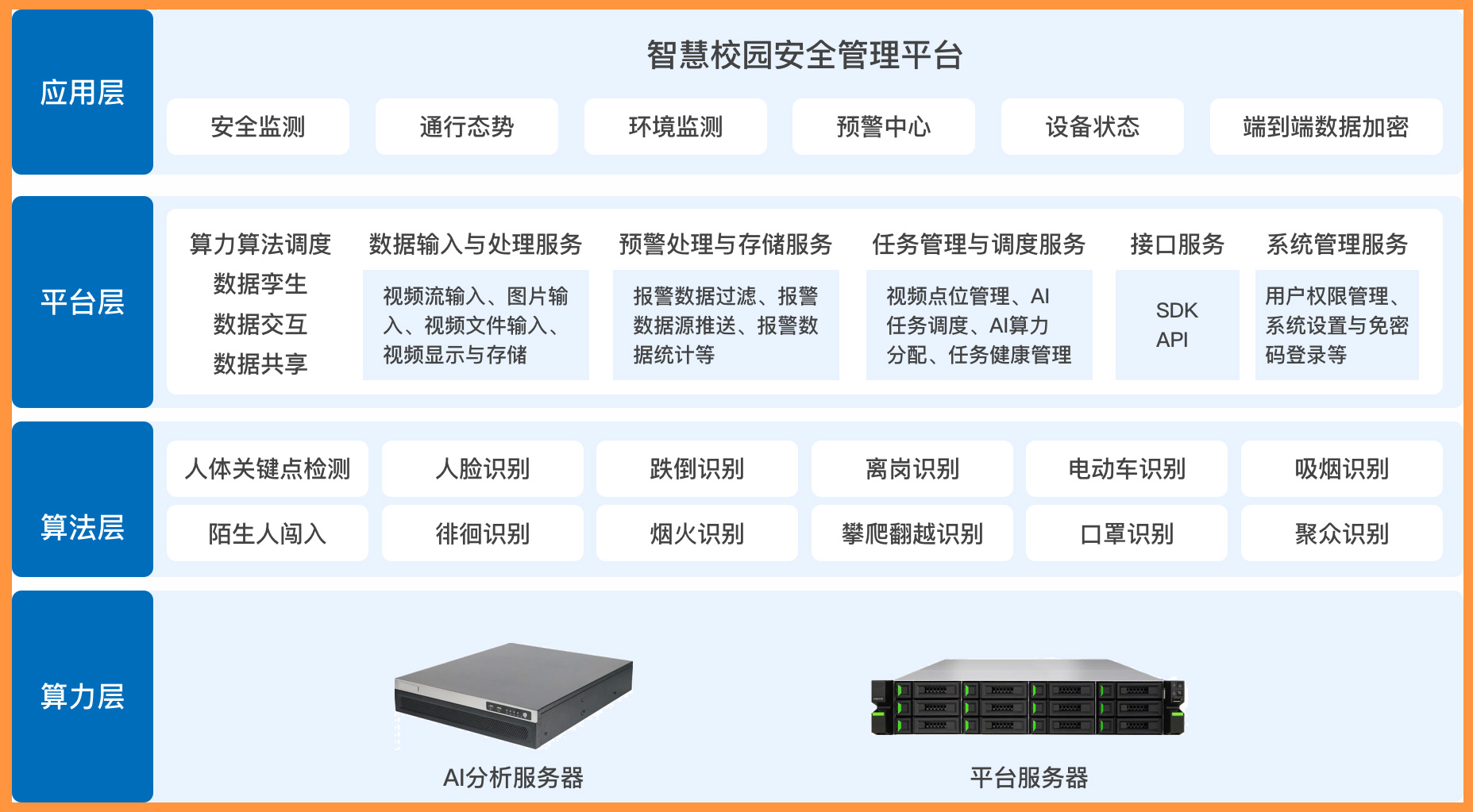 AI分析決策層: 基于強大的人工智能算法(計算機視覺CV、行為分析、模式識別、大數(shù)據(jù)分析等),系統(tǒng)能: